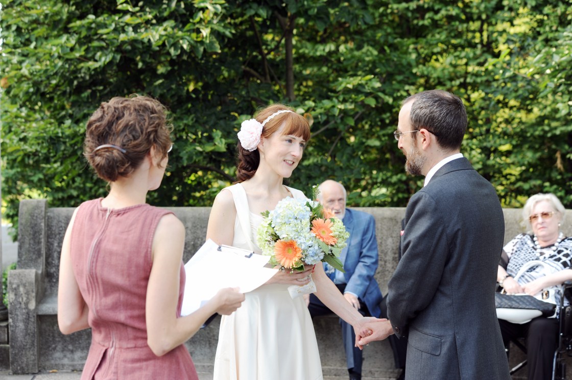 I highly recommend that couples consider getting married in the Brooklyn Botanical Gardens. Wedding ceremonies there are sublime. The beauty and tranquility within the various gardens — Osborne, Rose, Japanese, et cetera — create idyllic conditions for a serene marriage ceremony. Best of all, you can rent a garden for the ceremony only or invite everyone you know to an extravaganza. The BBG works equally well for intimate and large celebrations of love. Cherry Blossom season (late April-mid May) and the Rose Garden (June) are perhaps the most incredible places in terms of the space+ time +peak bloom formula. M+S, above, invited close relatives and friends to witness the exchange of their vows to the Osborne Garden in early/mid September. And the Gardens were still lovely! I hope they enjoyed their wedding as much as I appreciated officiating their Brooklyn ceremony!