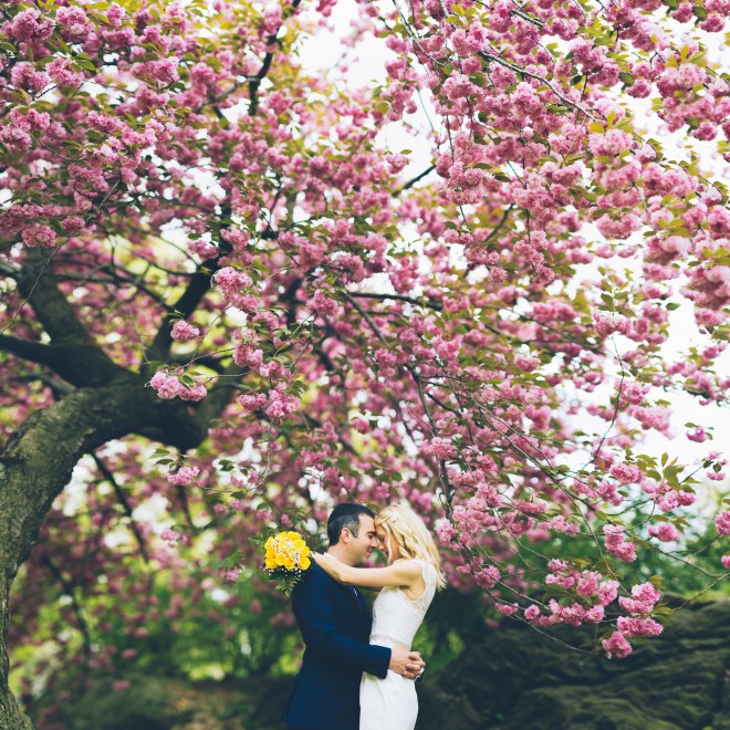 In late April and early May, the Magnolia and Cherry Blossoms trees were magnificent. Walk among them, and you will immediately feel calmer and happier. Since J+S married in the morning and in a quiet nook overlooking the Lake, their Central Park wedding felt relaxed and peaceful. Taken by the fantastic Sascha Reinking, the amazing photos above clearly reflect their joy.