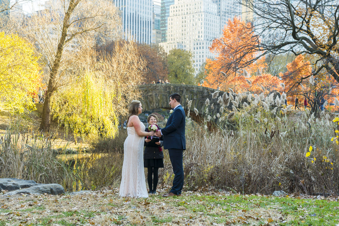 I greatly appreciate couples who take me to new places throughout the city. At the same time, Central Park is a home wedding base. Again and again, I return there to officiate marriage ceremonies for international couples — Europeans, Australians, Canadians, and others — and local New Yorkers alike. Each season brings unique delights. In the Autumn, the leaves change into bright reds, yellows, and oranges against a backdrop of greens and browns. Among the park niches, the Gapstow Bridge area displays the contrasts brilliantly. This area has it all. A skyline with trees and buildings. Close proximity to the street. A stone bridge and water. So why not elope here?